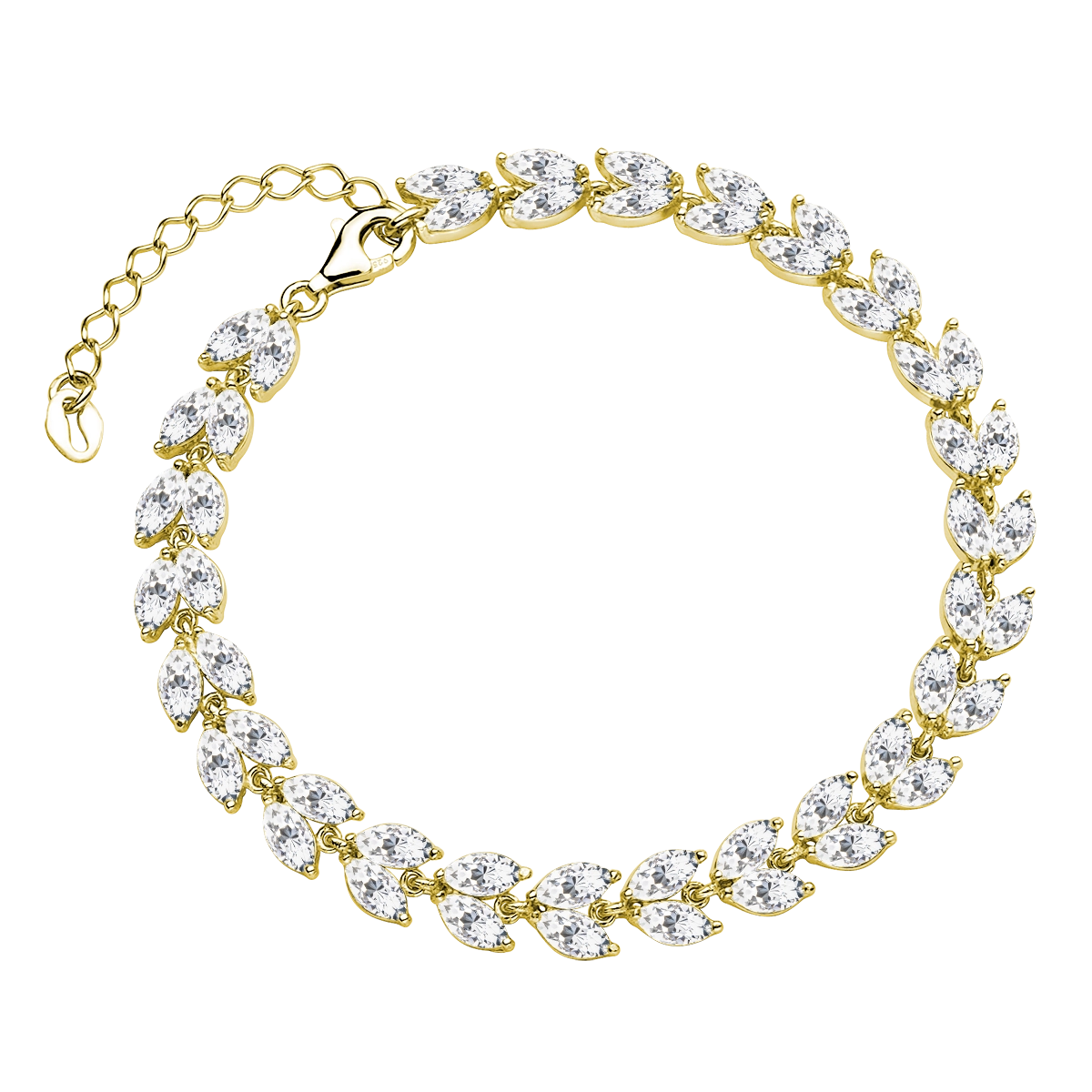 Bransoletka srebrna pozłacana, wykonana z wysokiej jakości srebra próby 925, zachwyca elegancją i blaskiem. Zdobiona podłużnymi cyrkoniami, ułożonymi w dwóch rzędach w kształcie liści, tworzy efektowną, a zarazem delikatną kompozycję. Idealna jako biżuteria ślubna lub na wyjątkowe okazje. Zapięcie typu karabińczyk zapewnia komfort noszenia.