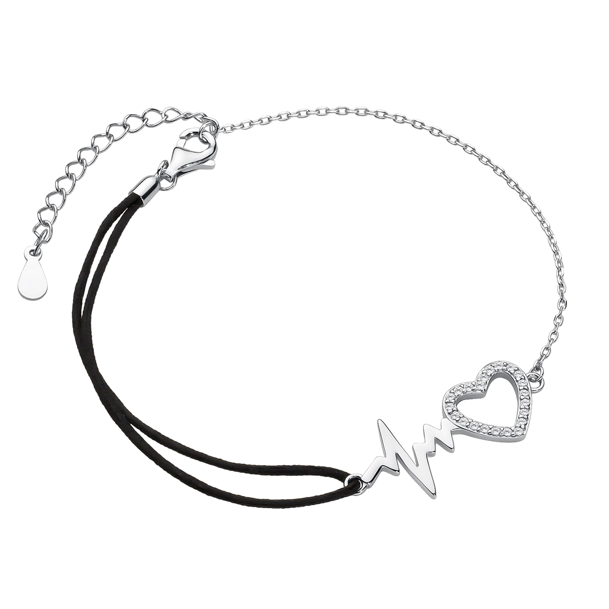 Srebrna bransoletka próby 925, rodowana, z centralnym elementem w postaci linii życia i serca zdobionego cyrkoniami. Z jednej strony wykończona srebrnym łańcuszkiem, a z drugiej czarnym sznurkiem, co nadaje jej nowoczesny charakter. Posiada zapięcie na karabińczyk i regulację długości dla idealnego dopasowania.