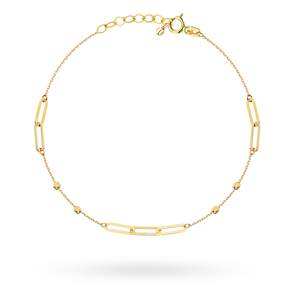 Elegancka złota bransoletka próby 585 o nowoczesnym splocie łączącym ozdobne ogniwa z dekoracyjnymi kostkami. Starannie wykonana, pięknie odbija światło i stanowi stylowy dodatek zarówno do codziennych, jak i eleganckich stylizacji. Ponadczasowy wzór sprawia, że bransoletka doskonale sprawdzi się również jako wyjątkowy prezent.