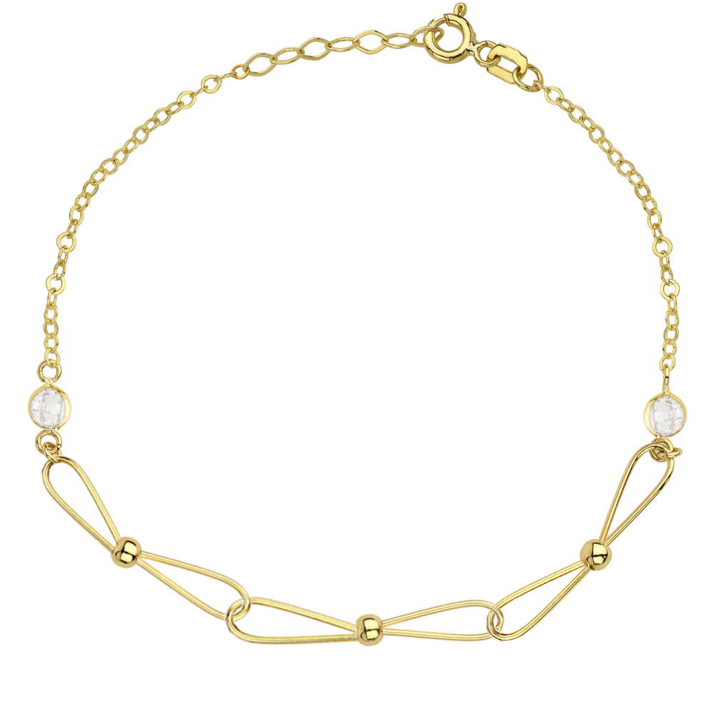 Elegancka złota bransoletka próby 585 o nowoczesnym splocie łączącym ozdobne ogniwa z kulkami. Po bokach białe cyrkonie. Starannie wykonana, pięknie odbija światło i stanowi stylowy dodatek zarówno do codziennych, jak i eleganckich stylizacji. Ponadczasowy wzór sprawia, że bransoletka doskonale sprawdzi się również jako wyjątkowy prezent.