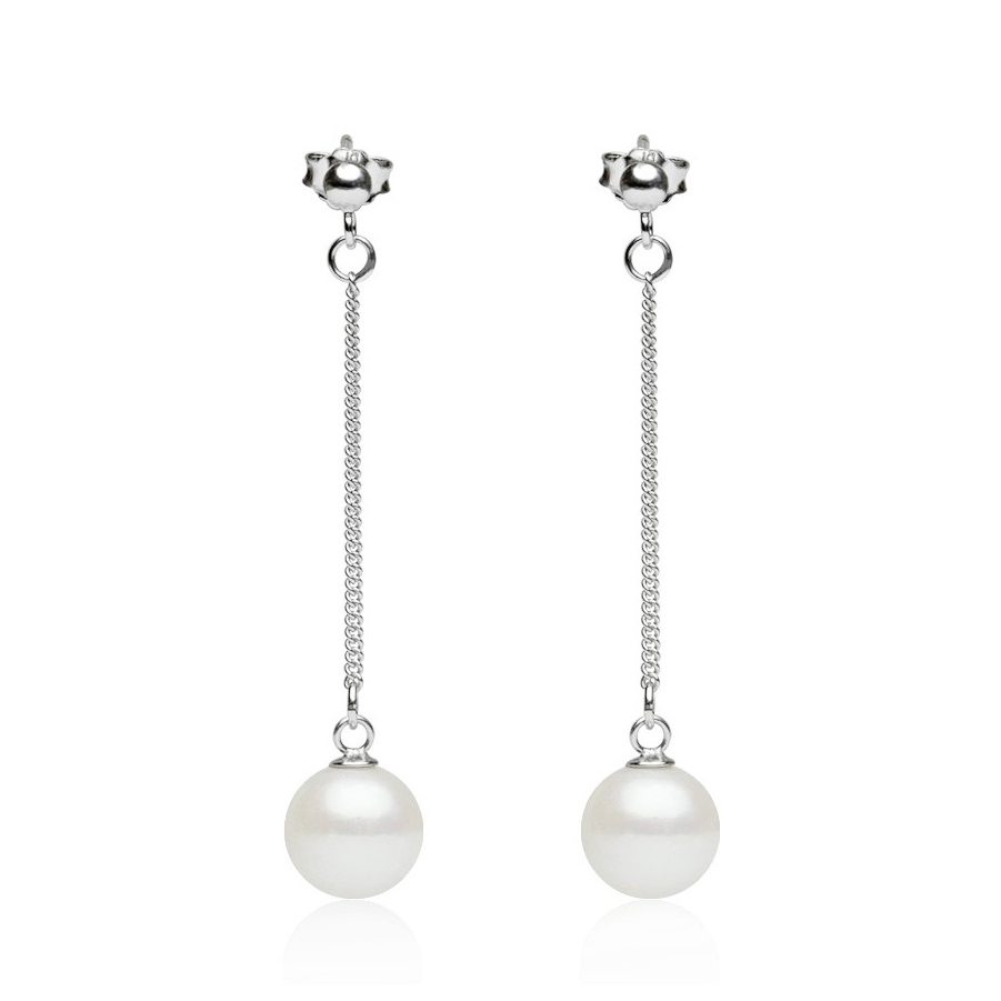 Kolczyki z pereł słodkowodnych – delikatna i kobieca biżuteria o nowoczesnym charakterze. Wykonane z rodowanego srebra próby 925, posiadają zapięcie typu sztyft. Subtelny, wiszący łańcuszek zakończony jest białą perłą o średnicy 8–9 mm, która pięknie kołysze się przy ruchu. Lekka forma i elegancki połysk sprawiają, że kolczyki idealnie sprawdzą się zarówno na co dzień, jak i na specjalne okazje.