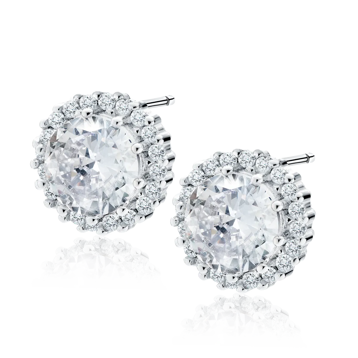 Srebrne kolczyki próby 925, rodowane, z centralnie osadzoną większą białą cyrkonią, otoczoną drobnymi cyrkoniami, które tworzą efektowną oprawę. Zapięcie na sztyft zapewnia wygodę i bezpieczeństwo noszenia. Klasyczny i ponadczasowy wzór, który doda blasku każdej stylizacji.