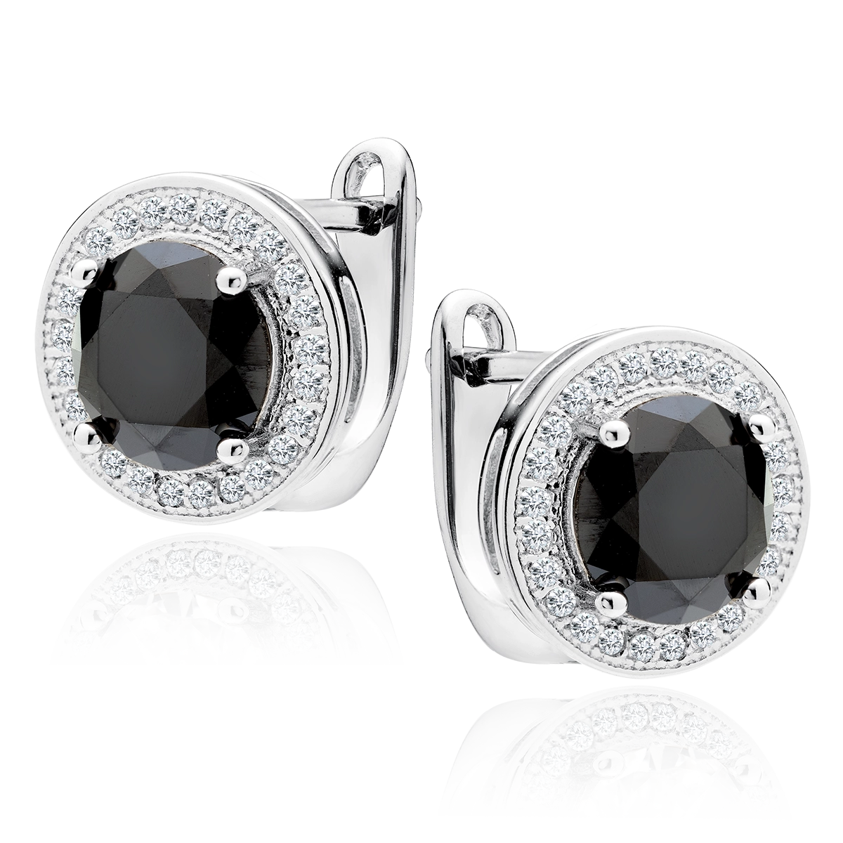 Kolczyki srebrne próby 925, o okrągłym kształcie, z centralnie osadzoną większą czarną cyrkonią, otoczoną mniejszymi białymi cyrkoniami. Pokryte rodem dla pięknego połysku i ochrony przed ciemnieniem, zapinane na wygodne angielskie zapięcie.