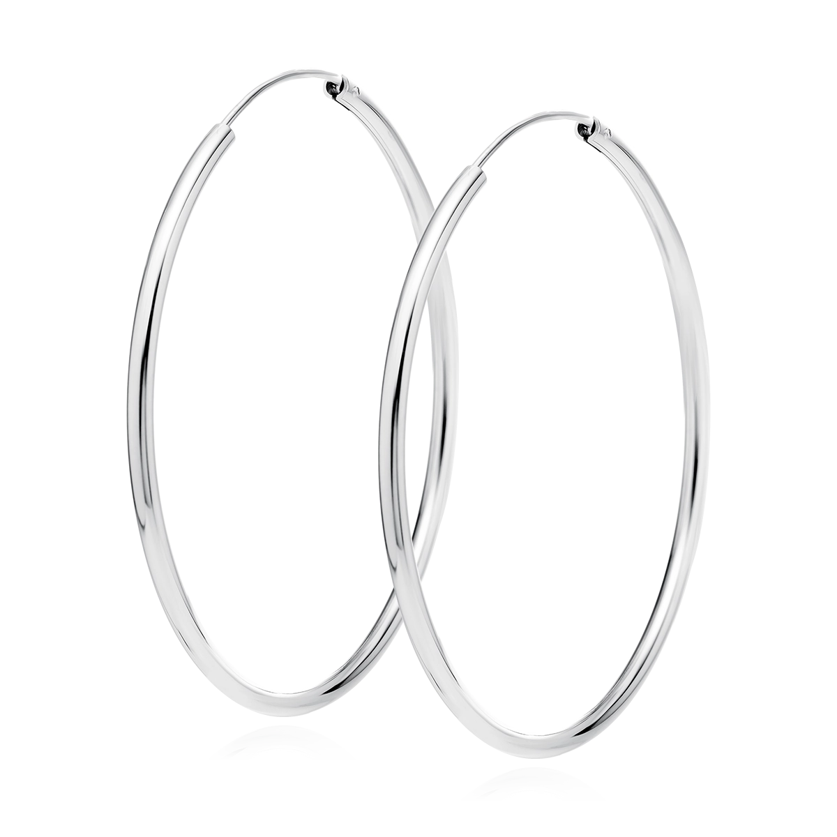 Kolczyki srebrne w kształcie klasycznych kół, wykonane ze srebra próby 925 i pokryte warstwą rodu dla ochrony przed ciemnieniem i nadania eleganckiego połysku. Średnica kolczyków wynosi 60 mm, co czyni je uniwersalnym dodatkiem do codziennych i bardziej eleganckich stylizacji. Zapięcie typu szarnir. Ponadczasowy wybór dla miłośniczek minimalistycznej biżuterii.