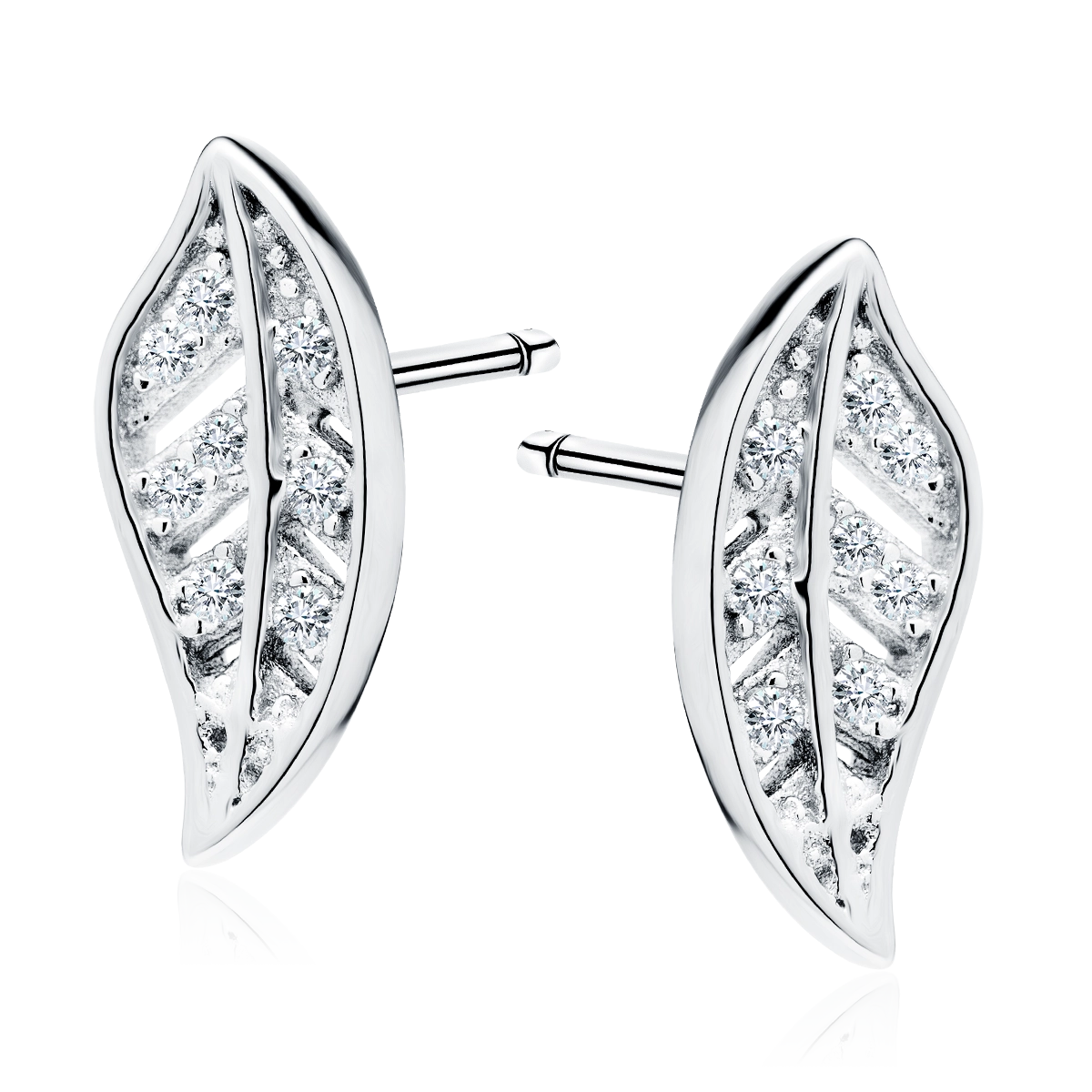Kolczyki srebrne w kształcie listka, wykonane ze srebra próby 925, rodowane. Subtelny, roślinny motyw został ozdobiony drobnymi, białymi cyrkoniami, które nadają blasku i elegancji. Zapięcie na sztyft zapewnia komfort noszenia. Delikatny wzór sprawdzi się zarówno na co dzień, jak i do bardziej eleganckich stylizacji.