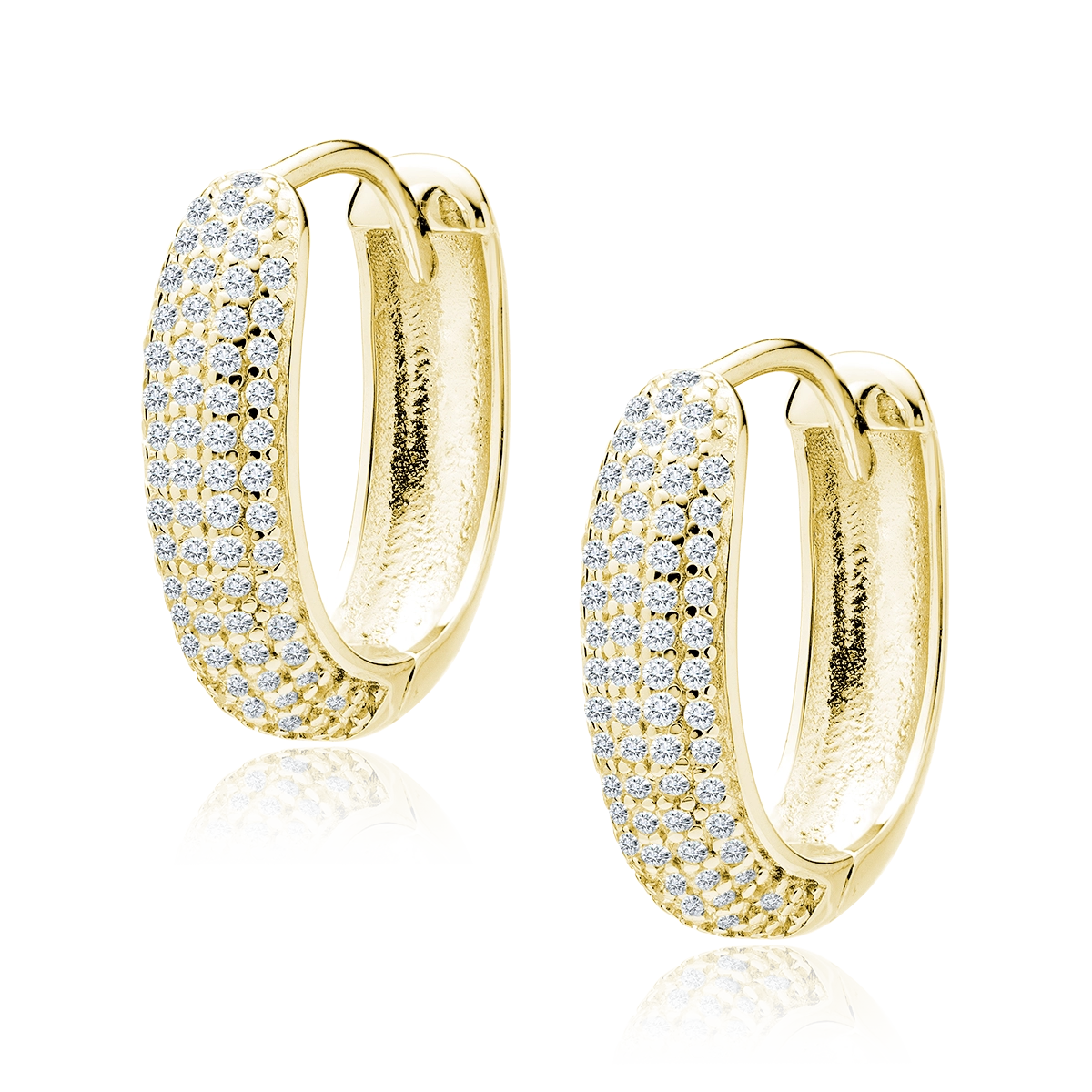 Kolczyki srebrne pozłacane próby 925, w kształcie kółek o szerokości 5 mm, z przodu ozdobione lśniącymi białymi cyrkoniami. Zapięcie zatrzaskowe zapewnia wygodę i bezpieczeństwo noszenia.