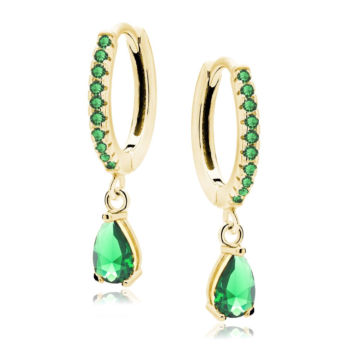Kolczyki ze srebra próby 925, pokryte złotem, z dekoracyjnym kółkiem przy uchu zdobionym zielonymi cyrkoniami oraz subtelnie zwisającą zieloną cyrkonią w kształcie łezki. Zapięcie typu zatrzask zapewnia wygodę i stabilność podczas noszenia.