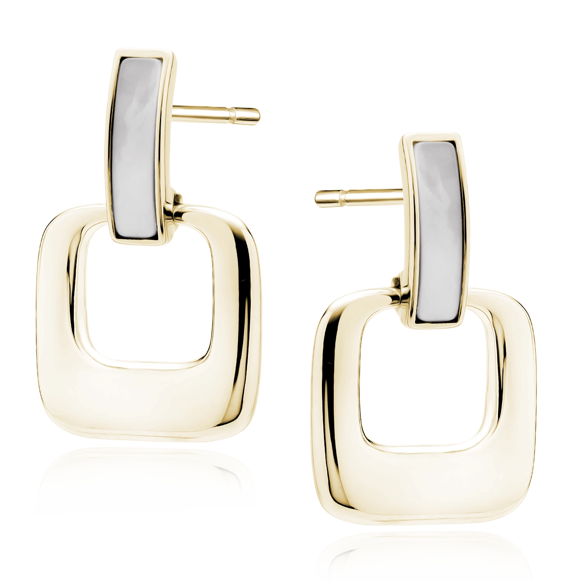 Kolczyki wykonane ze srebra próby 925, pokryte warstwą złota. Przy uchu ozdobione prostokątnym paskiem wypełnionym masą perłową, a poniżej zawieszką o gładkim, kwadratowym kształcie. Zapinane na sztyft, łączą elegancję z subtelnym blaskiem.