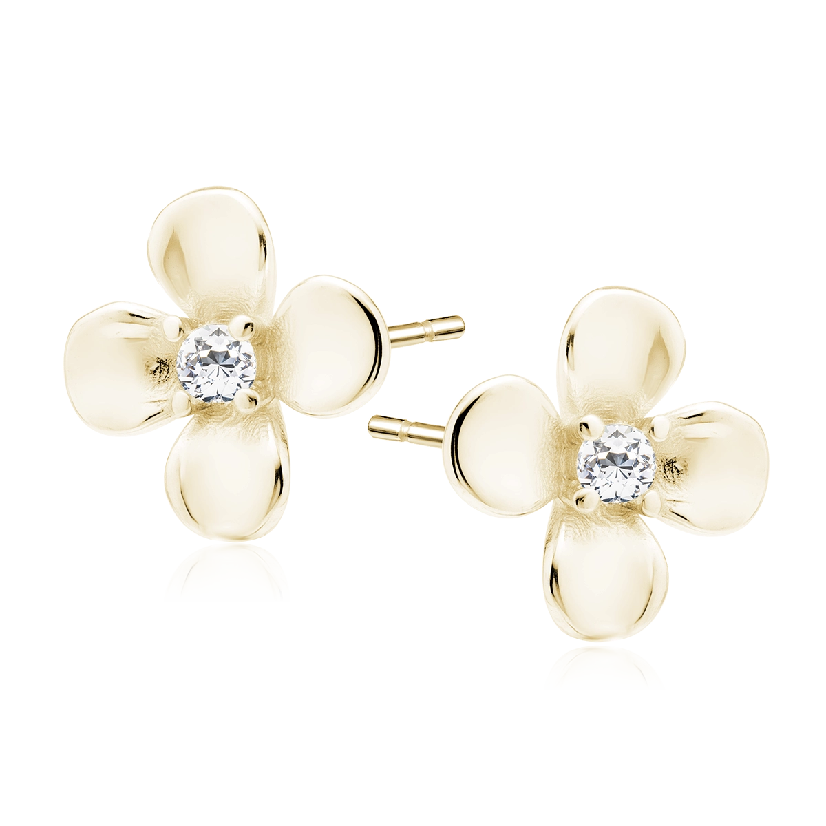 Delikatne srebrne kolczyki pozłacane, wykonane z próby 925, w kształcie kwiatka. W centrum każdego z nich znajduje się niewielka biała cyrkonia, która nadaje im subtelny, kobiecy akcent. Zapięcie na sztyft zapewnia wygodę noszenia. Idealne na co dzień i jako uzupełnienie romantycznych stylizacji.