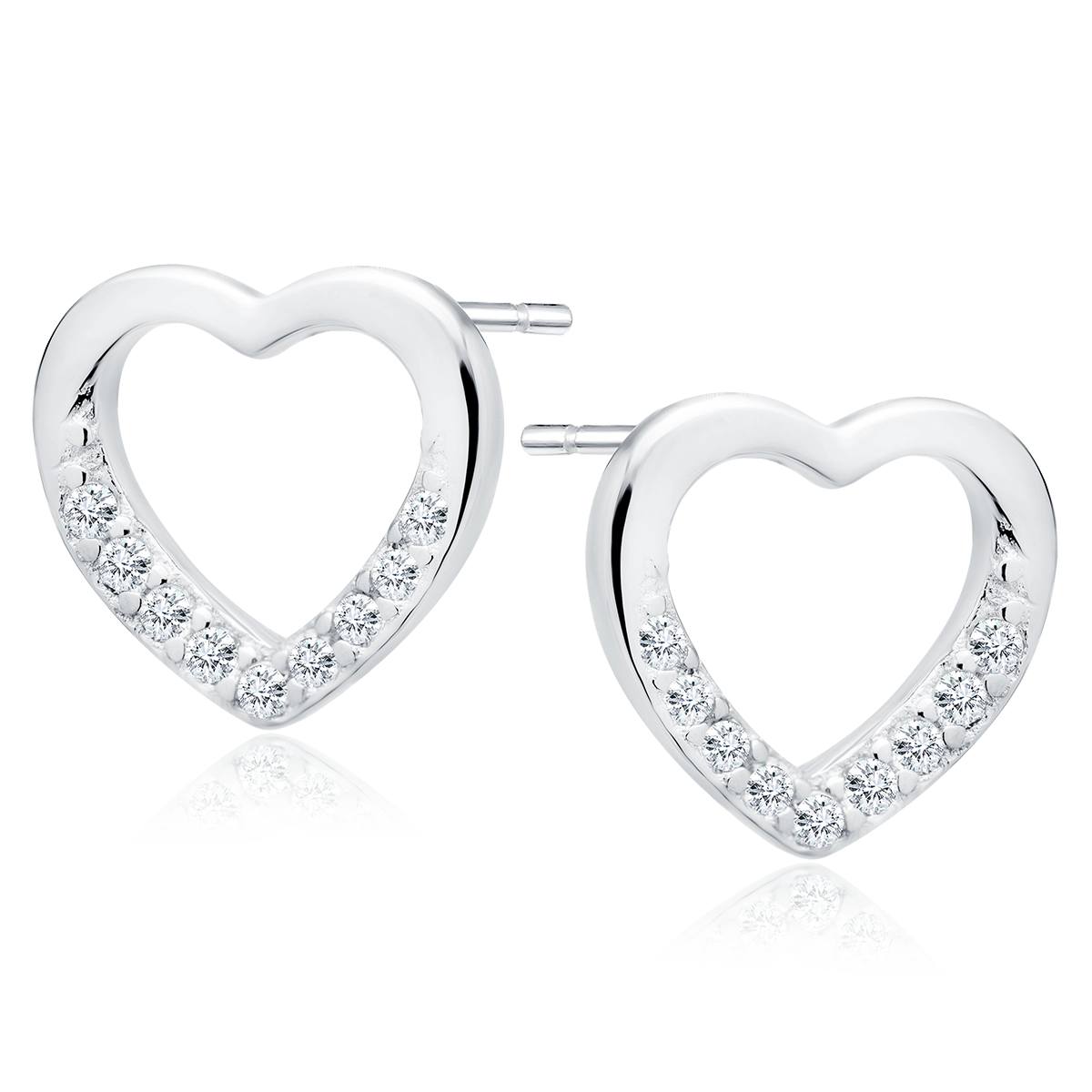 Srebrne kolczyki próby 925 w kształcie serc, zdobione lśniącymi białymi cyrkoniami. Wyposażone w zapięcie na sztyft, które zapewnia wygodę i bezpieczeństwo noszenia. Romantyczny i elegancki dodatek, idealny na co dzień i na wyjątkowe okazje.