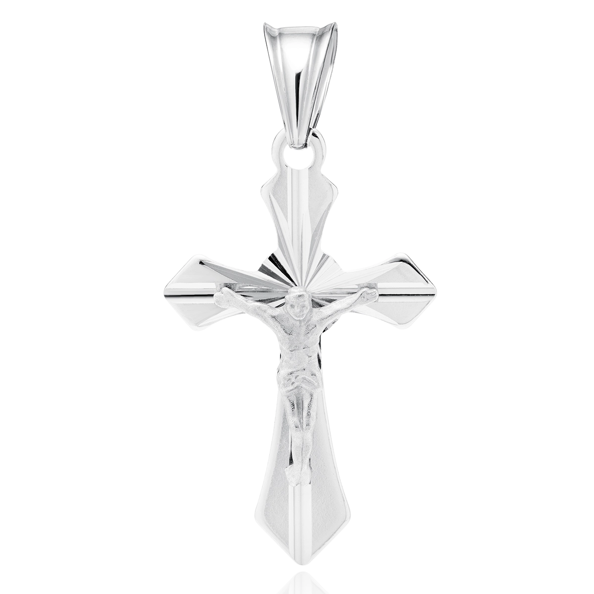 Srebrny krzyżyk próby 925 z wizerunkiem Pana Jezusa, pokryty rodem dla eleganckiego połysku i ochrony przed matowieniem. Klasyczny symbol wiary, odpowiedni do codziennego noszenia.