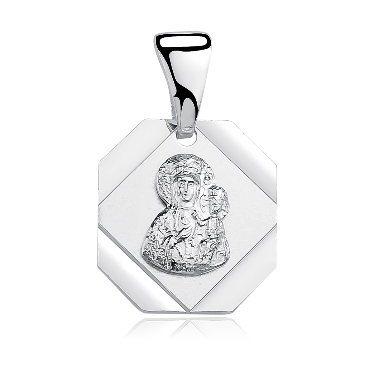Srebrny medalik próby 925 z wizerunkiem Matki Boskiej Częstochowskiej, o kanciastym kształcie. Pokryty rodem, który nadaje mu elegancki połysk i chroni przed matowieniem. Ponadczasowy symbol wiary, doskonały do codziennego noszenia.