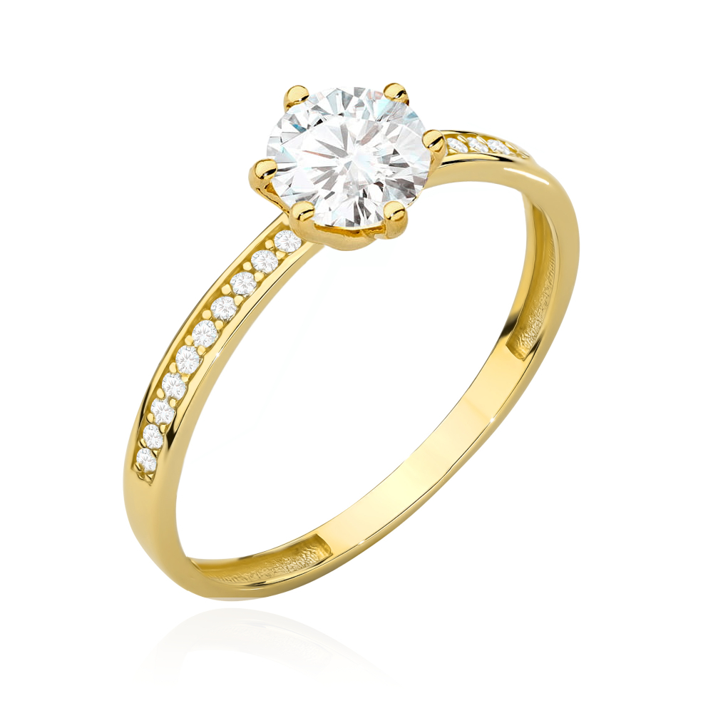 Złoty pierścionek próby 585 z centralnie osadzoną większą białą cyrkonią, oprawioną w sześć krap. Dodatkowo szynę zdobią drobne białe cyrkonie, które nadają całości wyjątkowego blasku i elegancji. Idealny wybór na zaręczyny lub jako efektowny dodatek na specjalne okazje.