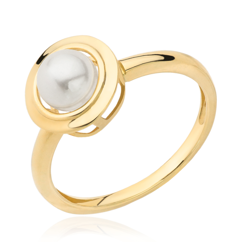 Złoty pierścionek próby 585 z elegancką, okrągłą górą, w której centralnie umieszczono klasyczną białą perłę. Model łączy ponadczasową prostotę z nutą wyrafinowania, dzięki czemu doskonale sprawdzi się zarówno na co dzień, jak i jako uzupełnienie wieczorowych stylizacji.