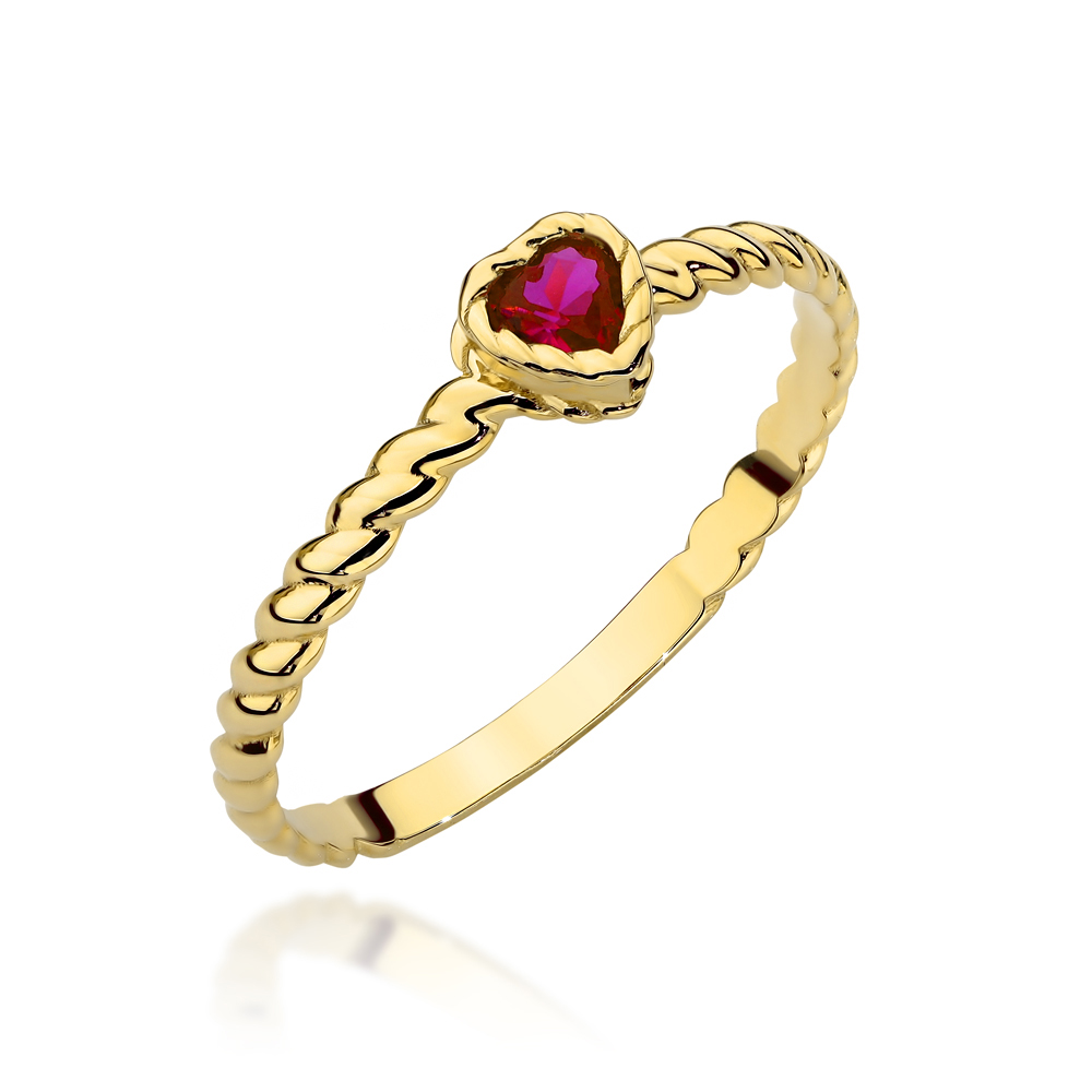 Romantyczny złoty pierścionek próby 585 z centralną cyrkonią w kształcie serca w różowym kolorze. Ozdobna, subtelnie skręcana szyna nadaje biżuterii lekkości i wyjątkowego charakteru. Kobiecy i elegancki model, idealny jako prezent wyrażający uczucia.