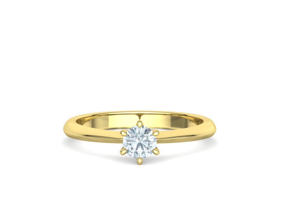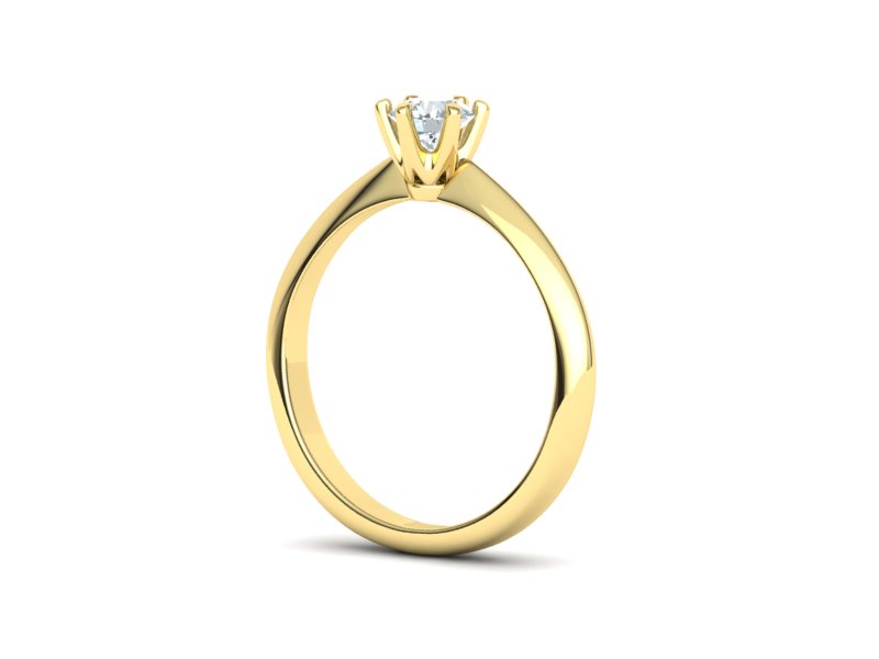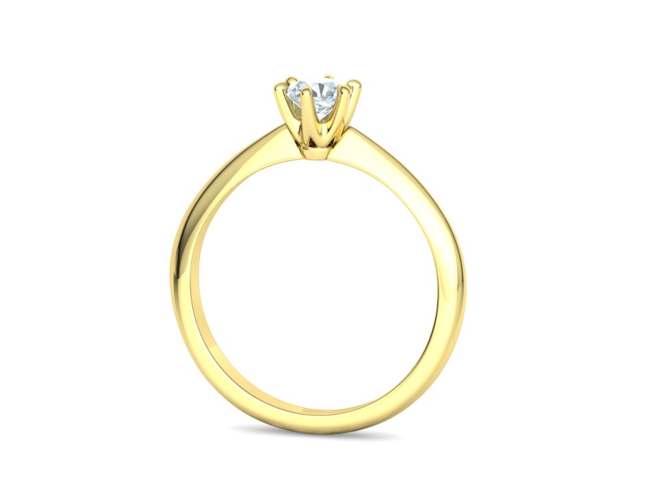 Klasyczny pierścionek z żółtego złota z centralnie osadzonym brylantem o bardzo dobrych parametrach VS1/G. Kamień o brylantowym szlifie zachwyca wyjątkowym blaskiem i doskonałą proporcją. Oprawa na 6 krap pięknie eksponuje brylant, a pełna, masywna szyna zapewnia trwałość i komfort noszenia. Ponadczasowy model idealny na zaręczyny.