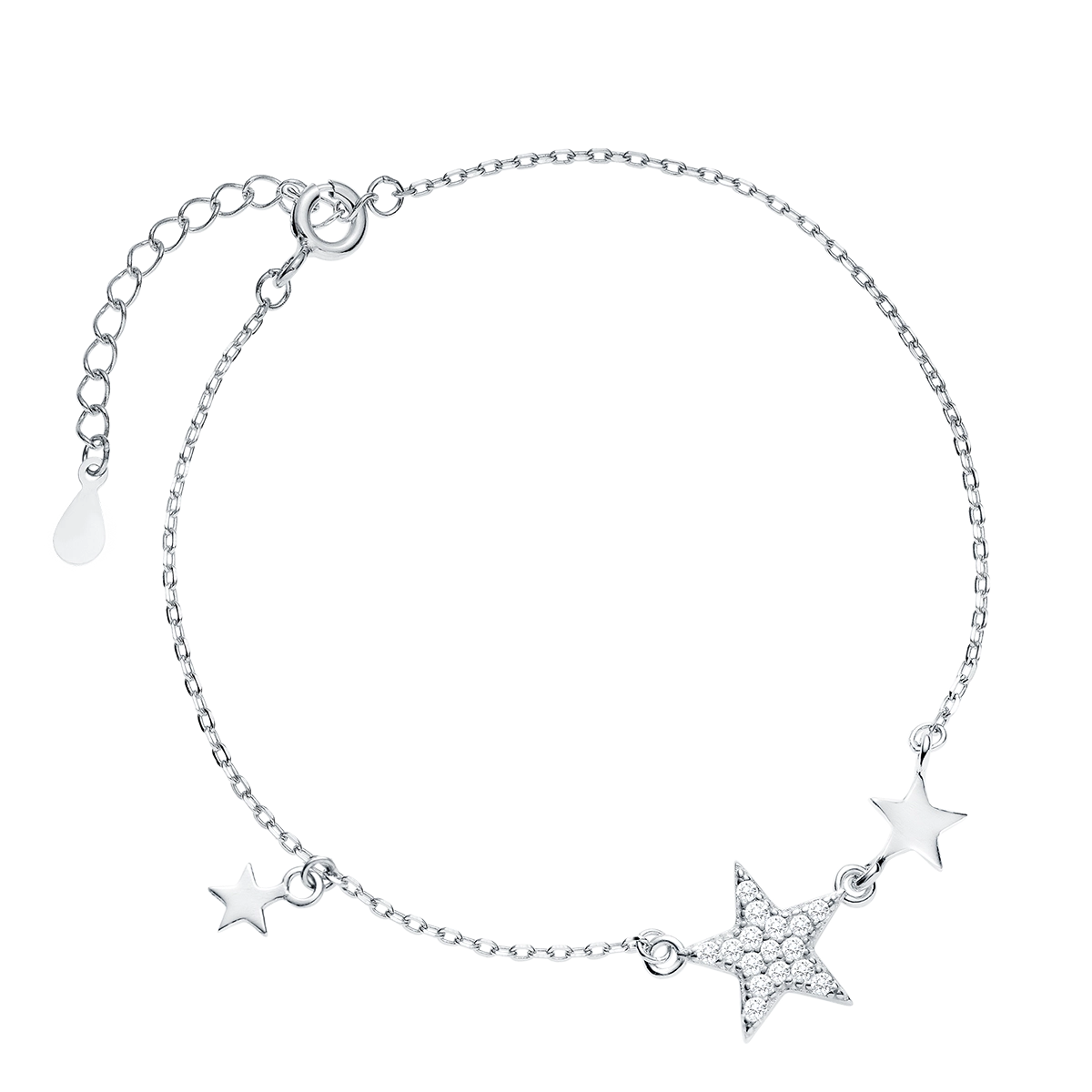 Srebrna bransoletka damska z najwyższej jakości srebra próby 925 to subtelny, elegancki dodatek. Centralnie umieszczona zawieszka w kształcie gwiazdki, zdobiona cyrkoniami, przyciąga wzrok i dodaje blasku. Po obu stronach łańcuszka znajdują się drobne, urocze gwiazdki, które dopełniają stylowy wygląd.