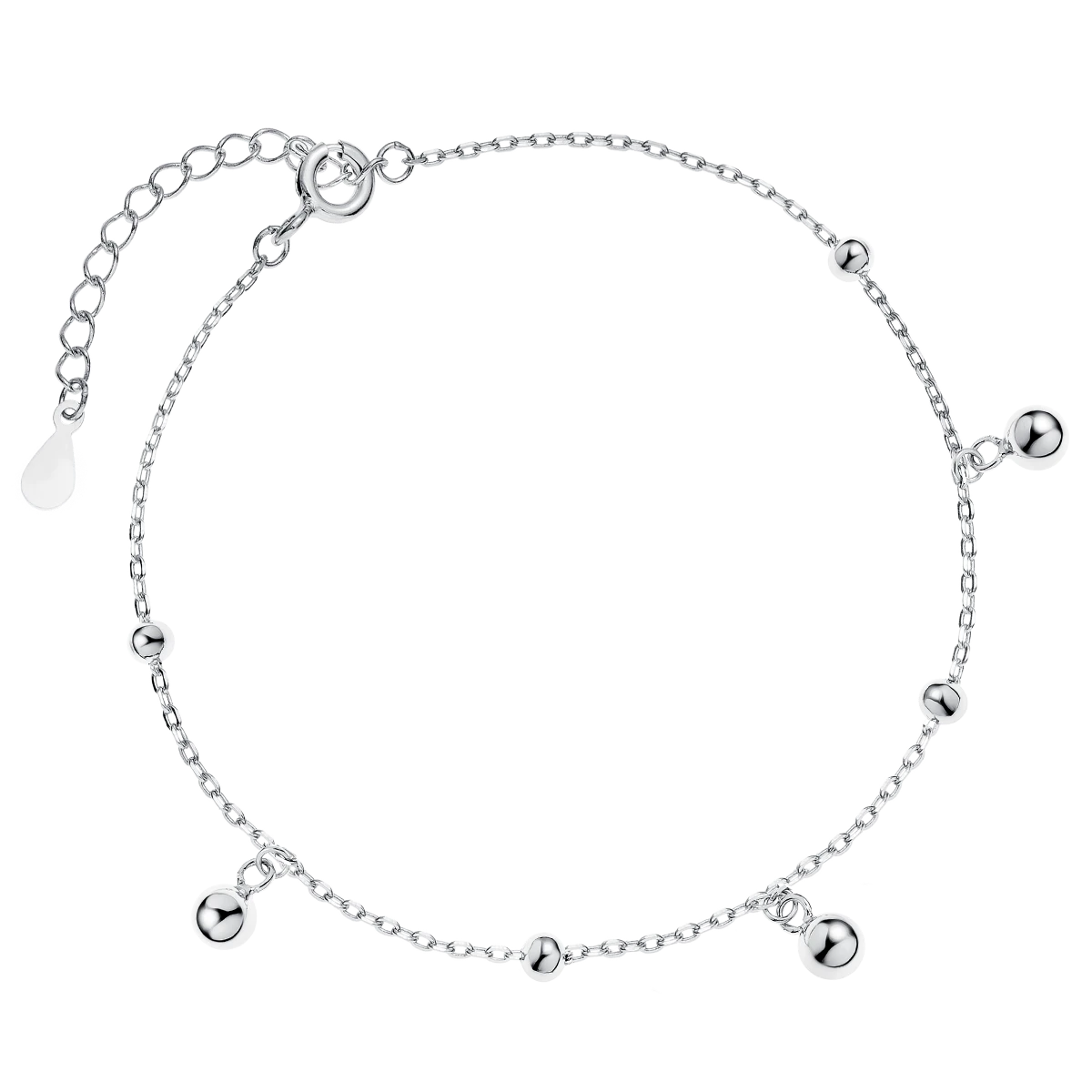 Srebrna bransoletka próby 925, rodowana, z drobnymi kulkami umieszczonymi na łańcuszku oraz lekko wiszącymi, co nadaje jej subtelny, ruchomy efekt. Wyposażona w regulację długości i zapięcie typu federing, dzięki czemu łatwo dopasować ją do nadgarstka.