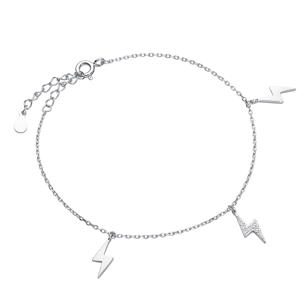 Srebrna bransoletka próby 925, rodowana, z lekko wiszącymi zawieszkami w kształcie błyskawic – centralna zdobiona jest lśniącymi białymi cyrkoniami. Wyposażona w zapięcie typu federing i regulację długości, co umożliwia idealne dopasowanie do nadgarstka. Nowoczesny i oryginalny dodatek do codziennych stylizacji.