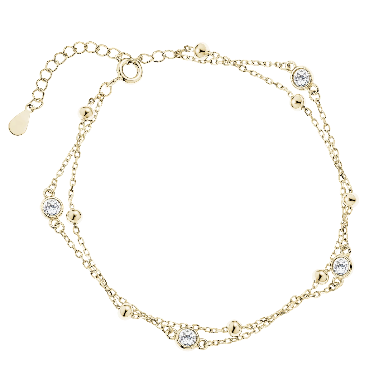 Srebrna bransoletka próby 925, pozłacana, podwójna – na jednym łańcuszku umieszczone są drobne kulki, a na drugim lśniące białe cyrkonie. Wyposażona w zapięcie typu federing i regulację długości, co pozwala idealnie dopasować ją do nadgarstka. Elegancki i nowoczesny dodatek na każdą okazję.