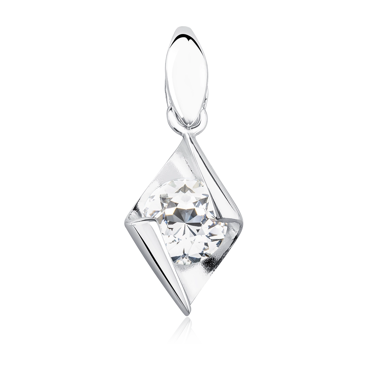 Srebrna zawieszka próby 925, ozdobna, z centralnie osadzoną okrągłą cyrkonią w kolorze białym. Pokrycie rodem nadaje biżuterii elegancki połysk i chroni ją przed matowieniem. To efektowny dodatek, który pięknie uzupełni zarówno codzienne, jak i wieczorowe stylizacje.