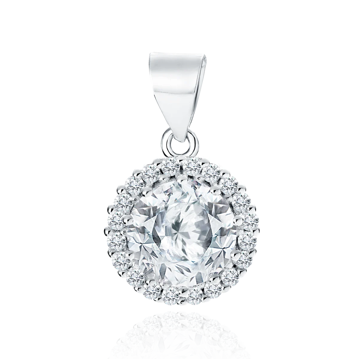 Srebrna zawieszka próby 925 zdobiona białymi cyrkoniami. Centralnie umieszczona większa, okrągła cyrkonia otoczona jest mniejszymi kamieniami, które podkreślają blask całości. Pokrycie rodem nadaje biżuterii elegancki połysk i chroni ją przed matowieniem. To klasyczna ozdoba, idealna do noszenia na co dzień i na specjalne okazje.