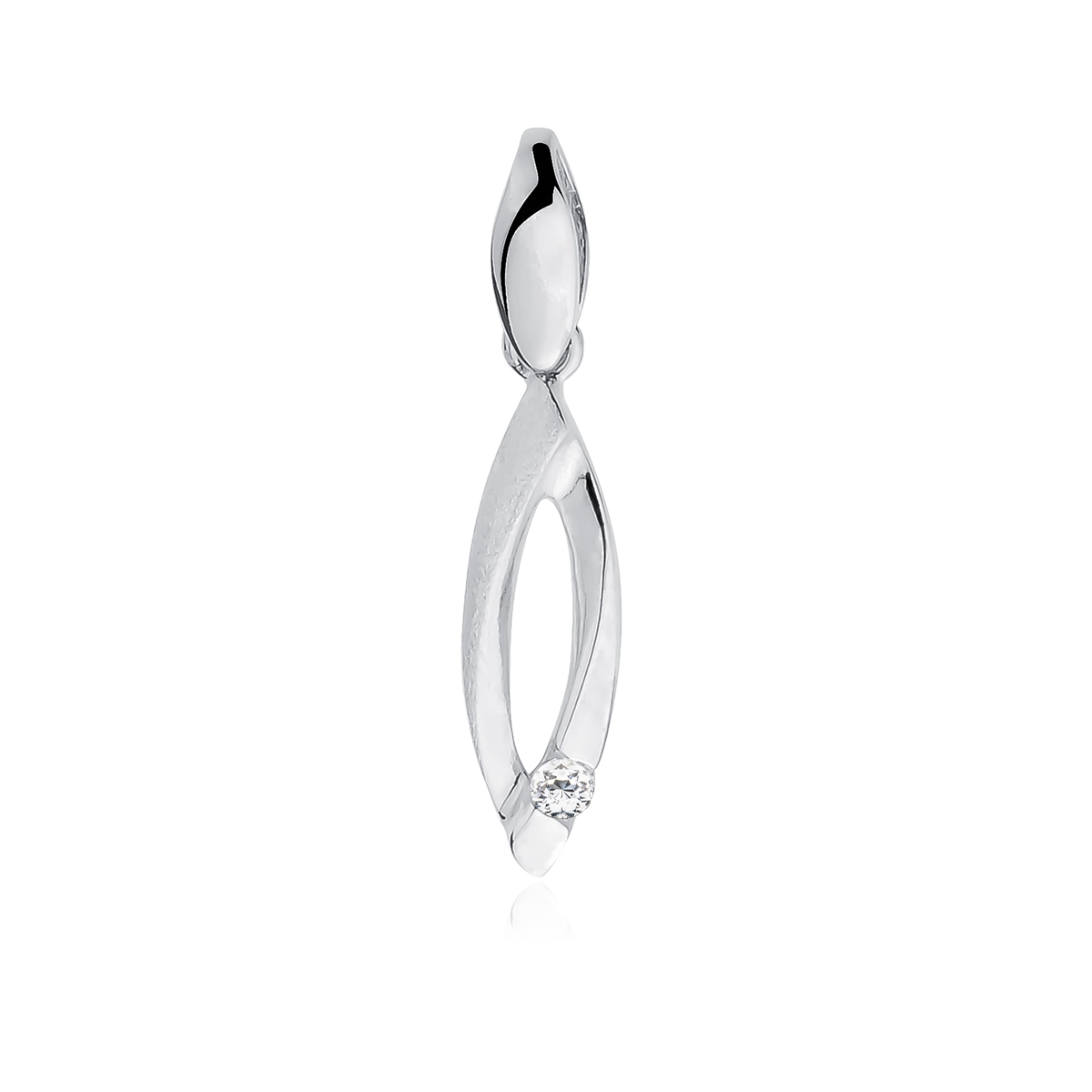 Srebrna zawieszka próby 925, podłużna i ozdobna, z osadzoną cyrkonią w kolorze białym. Pokrycie rodem nadaje biżuterii elegancki połysk i chroni ją przed matowieniem. To subtelny i efektowny dodatek, który pięknie uzupełni codzienne i eleganckie stylizacje.