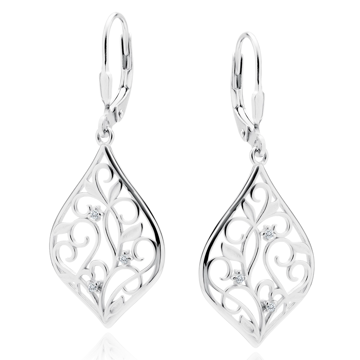Srebrne kolczyki o próbie 925 w formie lekkiego, ażurowego wzoru inspirowanego kształtem listków. Delikatnie zdobione białymi cyrkoniami, które dodają im subtelnego blasku. Pokryte rodem dla pięknego połysku i większej trwałości. Zapięcie typu bigiel angielski zapewnia wygodę i bezpieczeństwo noszenia. To elegancki dodatek, który podkreśli każdą stylizację – zarówno codzienną, jak i wieczorową.