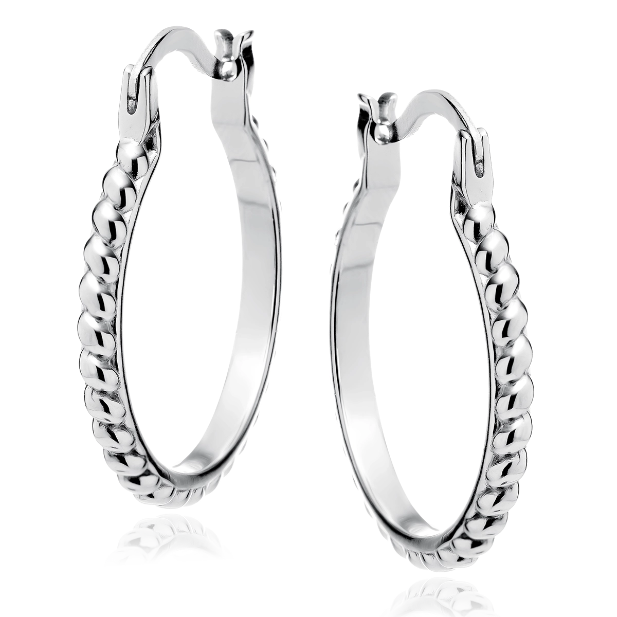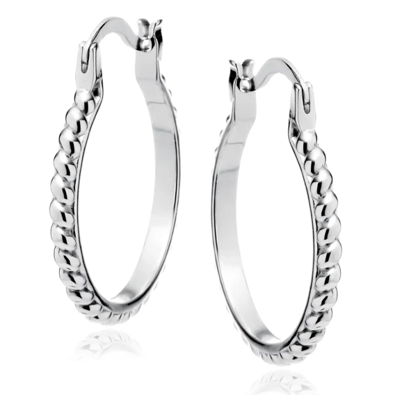 Srebrne kolczyki w klasycznym kształcie koła, wykonane ze srebra próby 925, rodowane dla trwałości i eleganckiego połysku. Zewnętrzna strona kolczyków ma dekoracyjny, skręcany wzór, który nadaje im oryginalny charakter. Zapięcie typu kreol zapewnia wygodę i bezpieczeństwo noszenia. Idealne zarówno na co dzień, jak i do bardziej eleganckich stylizacji.