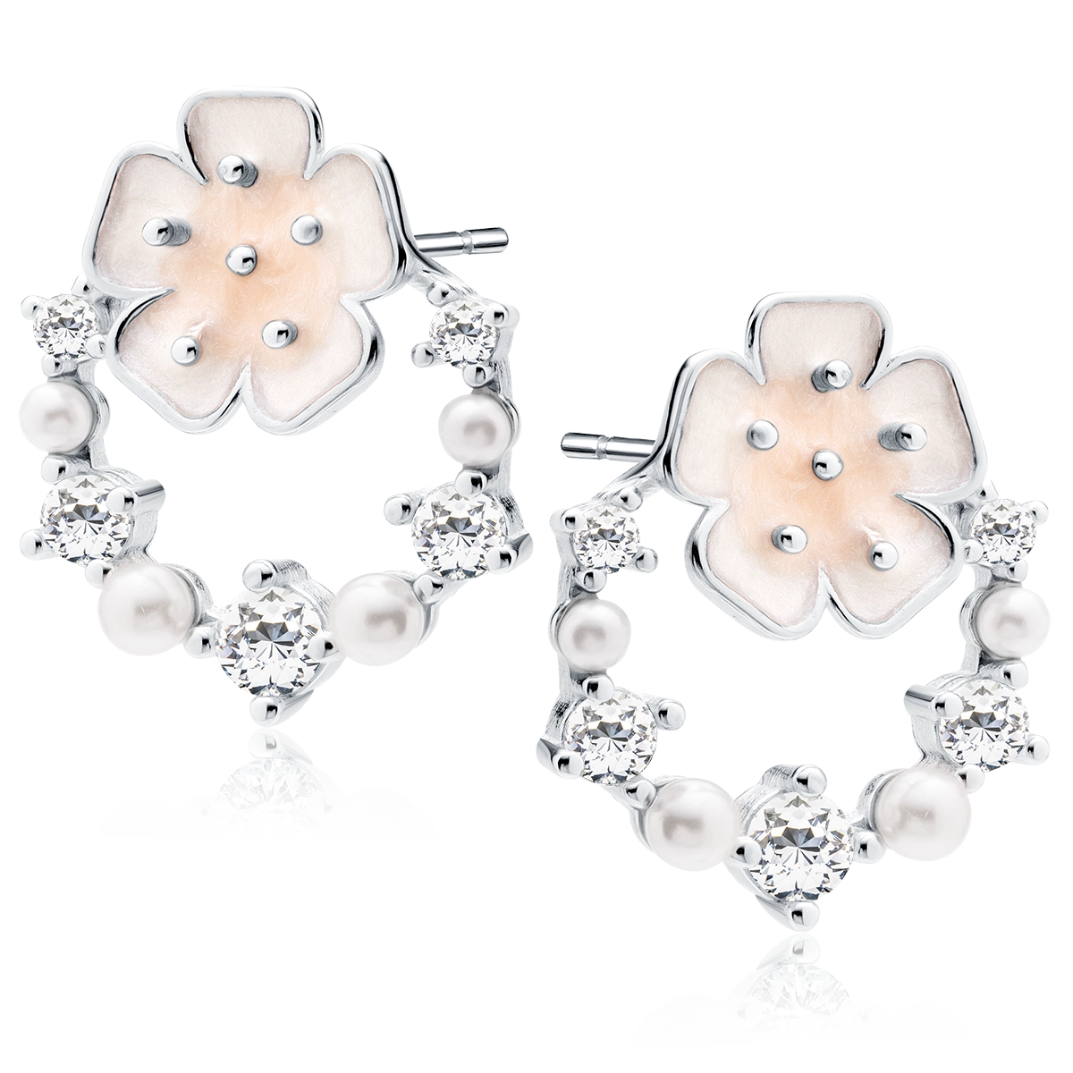 Srebrne kolczyki próby 925 o eleganckim, wiszącym fasonie w kształcie okręgu. Przy uchu znajduje się ozdobny kwiatek, a pod nim w kształt koła na przemian białe cyrkonie i perły. Pokrycie rodem nadaje kolczykom piękny połysk i chroni je przed matowieniem, a zapięcie na sztyft zapewnia wygodę noszenia. To subtelny i kobiecy dodatek, który pięknie podkreśli każdą stylizację, zarówno codzienną, jak i elegancką.