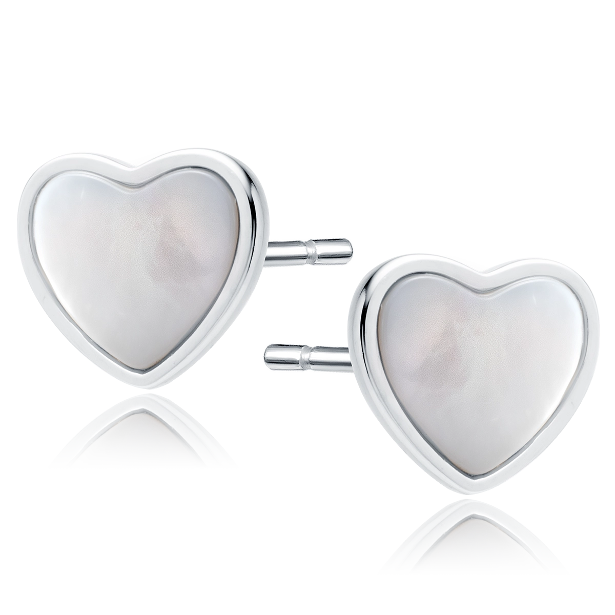 Srebrne kolczyki próby 925 w kształcie delikatnego serca, wypełnione masą perłową, która nadaje im subtelnego blasku i elegancji. Pokrycie rodem podkreśla połysk srebra i chroni biżuterię przed matowieniem. Zapięcie na sztyft zapewnia wygodę noszenia, czyniąc kolczyki idealnym dodatkiem zarówno do codziennych, jak i wyjątkowych stylizacji.