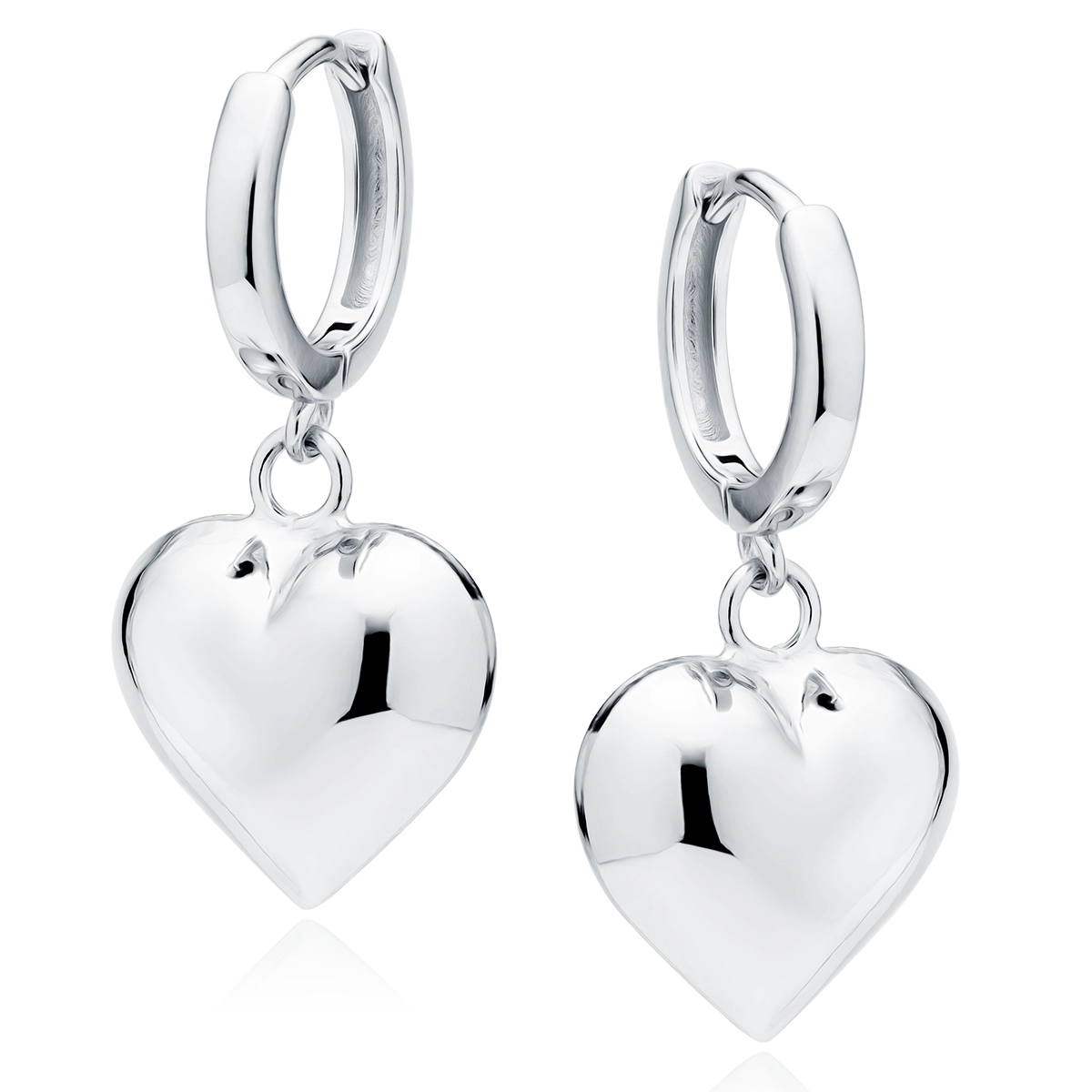 Srebrne kolczyki próby 925 o nowoczesnym, wiszącym fasonie. Przy uchu znajduje się delikatne kółko zapinane na zatrzask, z którego zwisa wypukłe serce puste w środku. Pokrycie rodem nadaje kolczykom piękny połysk i chroni je przed matowieniem, a jednocześnie podkreśla ich lekkość i elegancję. To subtelny i stylowy dodatek, idealny zarówno na co dzień, jak i na wyjątkowe okazje.