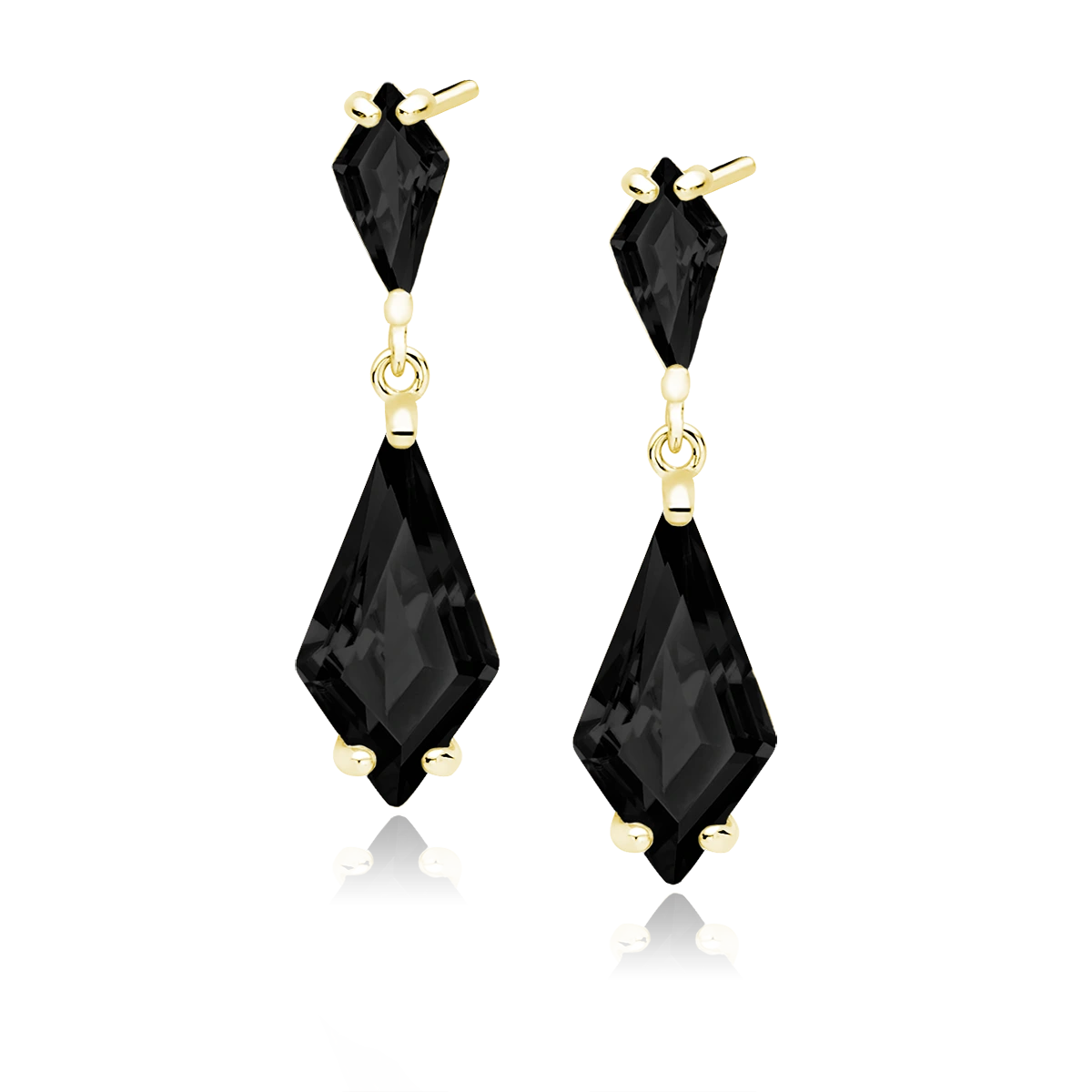 Srebrne kolczyki pozłacane próby 925 o eleganckim, wiszącym fasonie. Przy uchu osadzona została mniejsza czarna cyrkonia w kształcie rombu, z której zwisa większa cyrkonia w tym samym kształcie, tworząc spójną i efektowną całość. Zapięcie na sztyft zapewnia wygodę i stabilność noszenia. To wyjątkowy model biżuterii, który doda szyku i wyrazistości zarówno codziennym, jak i wieczorowym stylizacjom.