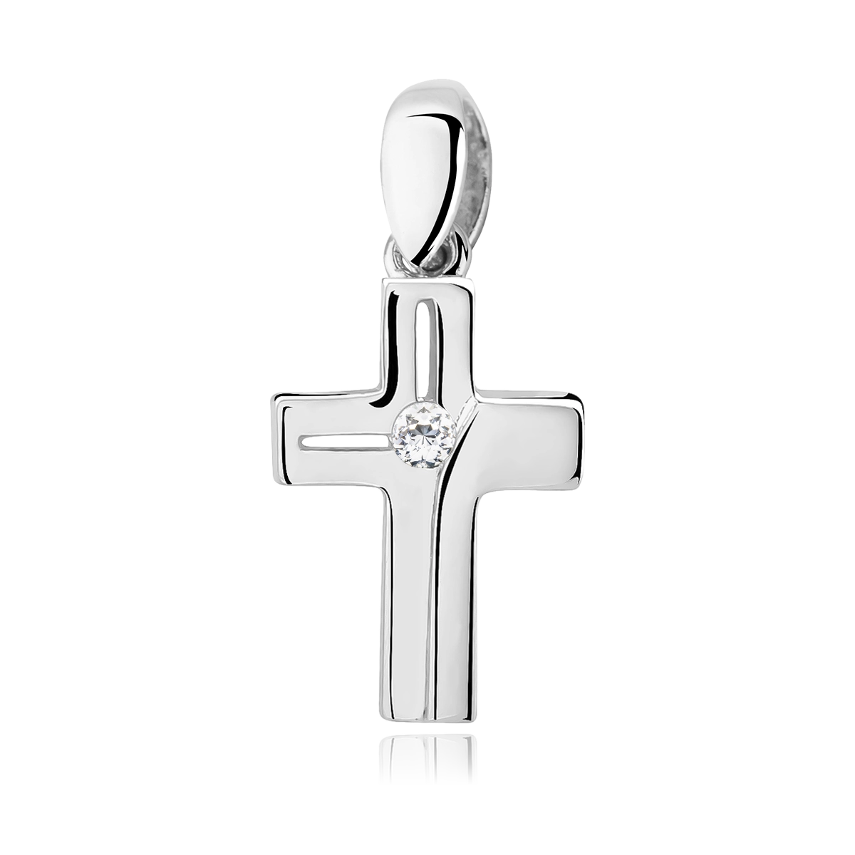 Srebrny krzyżyk próby 925, zdobiony lśniącą białą cyrkonią i pokryty rodem, który nadaje mu elegancki połysk i chroni przed matowieniem. Delikatny i efektowny symbol wiary, odpowiedni do codziennego noszenia.