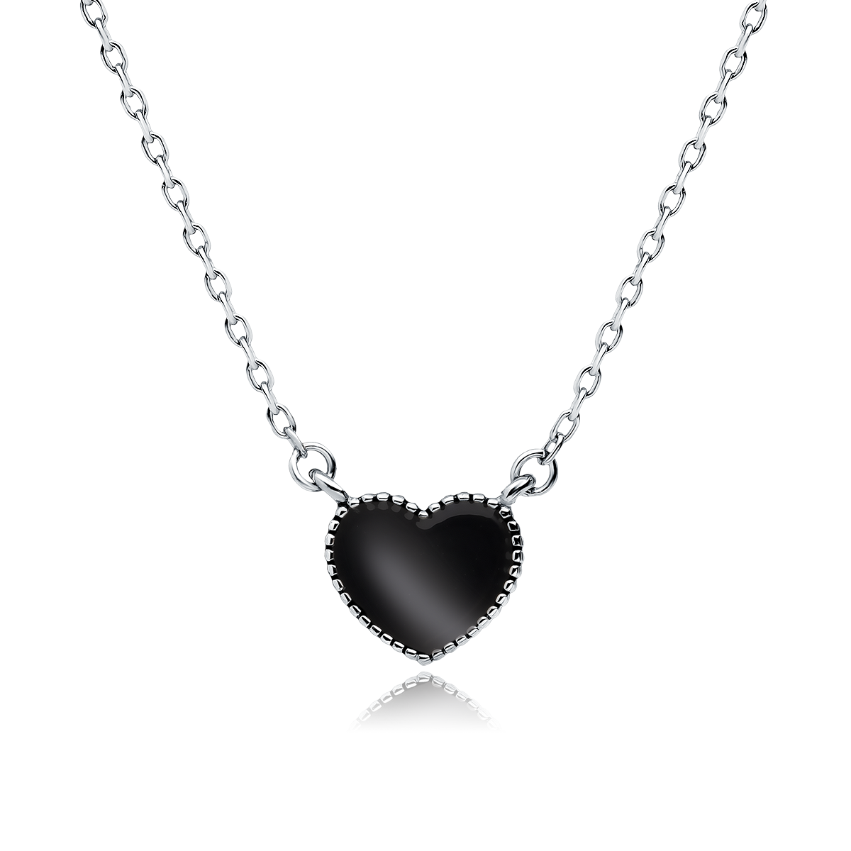 Srebrny naszyjnik próby 925 z zawieszką w kształcie serca wypełnioną czarną emalią. To elegancka i nowoczesna biżuteria. Pokrycie rodem nadaje naszyjnikowi piękny połysk i chroni go przed matowieniem. Regulowana długość łańcuszka pozwala na idealne dopasowanie, a zapięcie typu federing zapewnia wygodę i bezpieczeństwo noszenia. To stylowy dodatek, który świetnie uzupełni zarówno codzienne, jak i wieczorowe stylizacje.