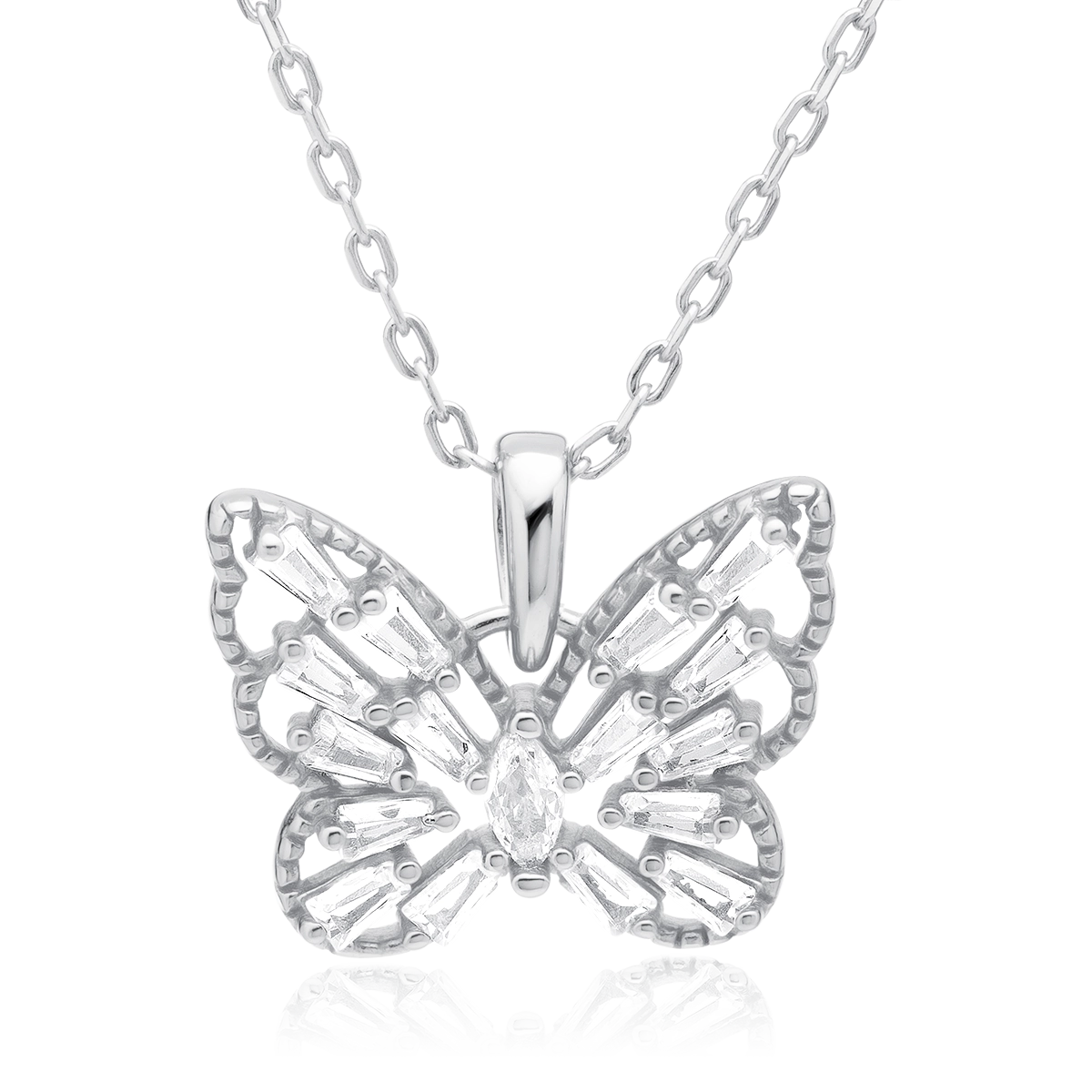 Srebrny naszyjnik próby 925 z okazałą zawieszką w kształcie motyla, zdobioną lśniącymi białymi cyrkoniami. Pokrycie rodem nadaje biżuterii elegancki połysk i chroni ją przed matowieniem. Regulowana długość łańcuszka pozwala idealnie dopasować naszyjnik do dekoltu, a zapięcie typu federing zapewnia wygodę i bezpieczeństwo noszenia. To efektowny dodatek, który pięknie podkreśli zarówno codzienne, jak i wieczorowe stylizacje.