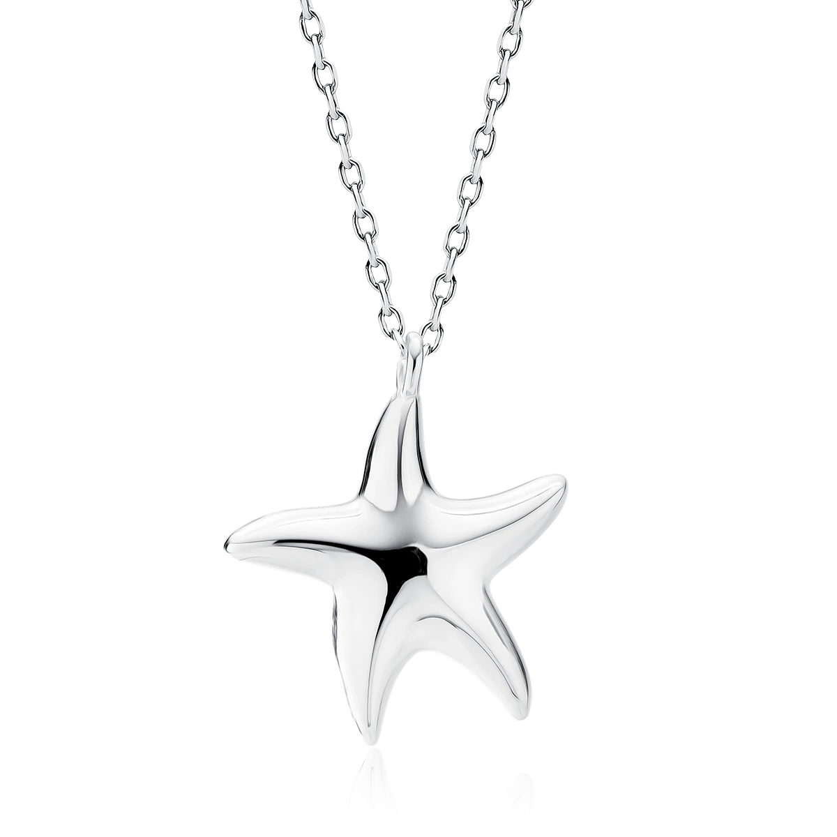 Srebrny naszyjnik próby 925 z zawieszką w kształcie rozgwiazdy. Pokrycie rodem nadaje biżuterii piękny połysk i chroni ją przed matowieniem. Regulowana długość łańcuszka oraz zapięcie typu federing zapewniają wygodę i bezpieczeństwo noszenia. To efektowny dodatek, który doskonale uzupełni zarówno codzienne, jak i eleganckie stylizacje.
