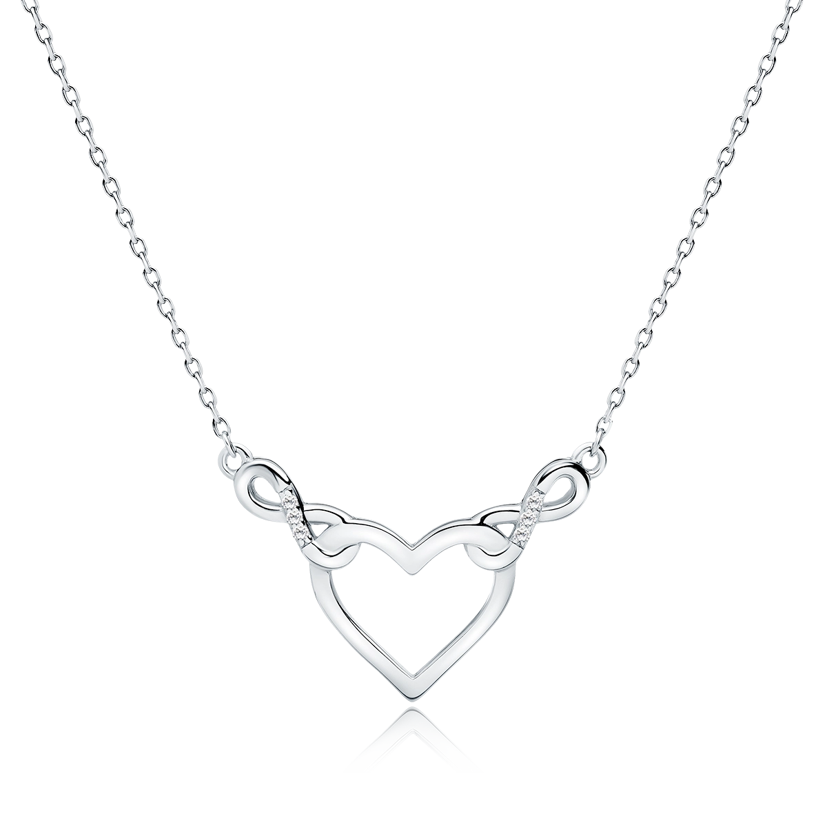 Srebrny naszyjnik próby 925 z zawieszką o wyjątkowym designie – centralnie serce, a po bokach symbole nieskończoności ozdobione lśniącymi cyrkoniami. Pokrycie rodem nadaje biżuterii elegancki połysk i chroni ją przed matowieniem. Regulowana długość łańcuszka pozwala na idealne dopasowanie, a zapięcie typu federing zapewnia wygodę i bezpieczeństwo noszenia. To subtelny i symboliczny dodatek, który pięknie uzupełni zarówno codzienne, jak i eleganckie stylizacje.
