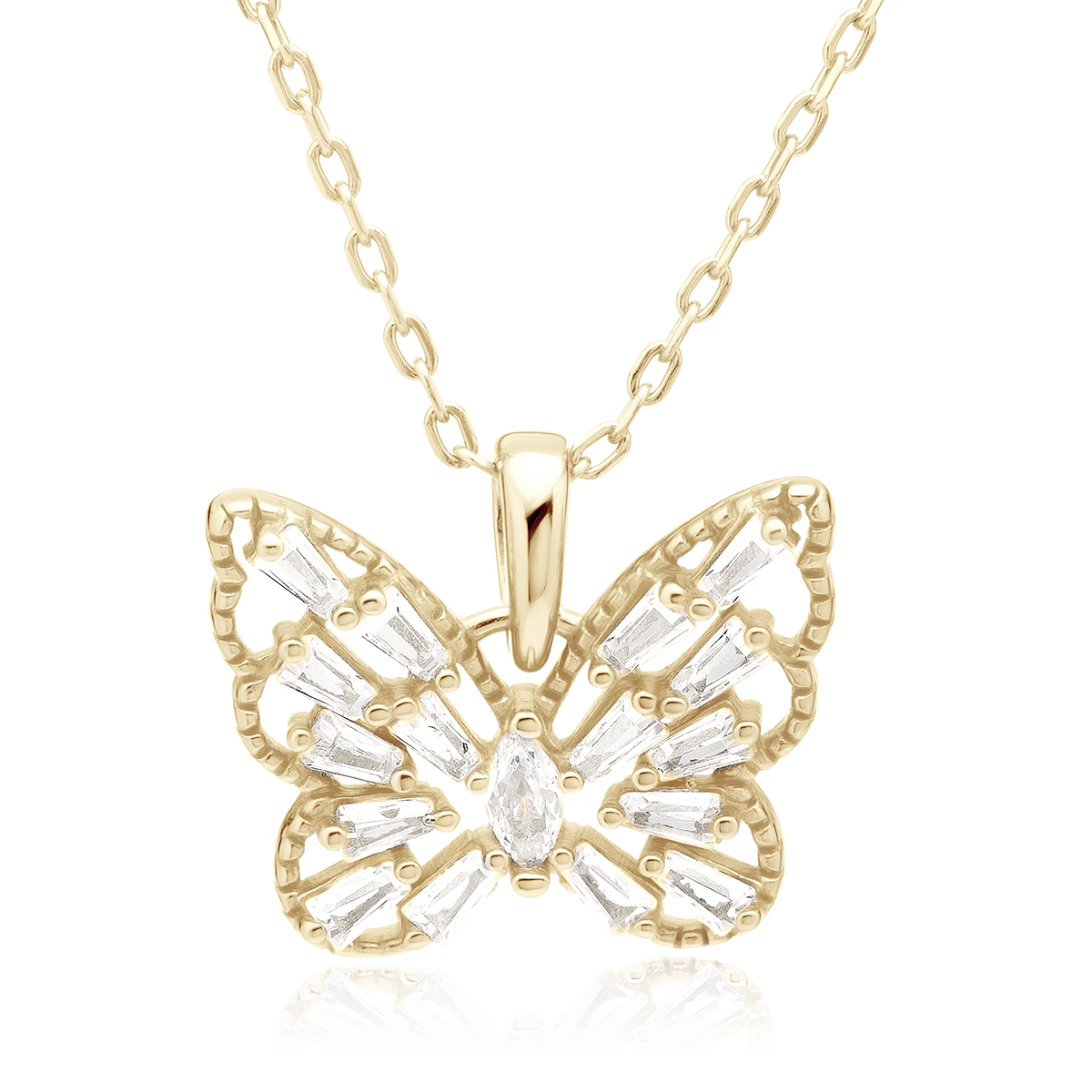 Pozłacany srebrny naszyjnik próby 925 z okazałą zawieszką w kształcie motyla, ozdobioną lśniącymi białymi cyrkoniami. Regulowana długość łańcuszka pozwala idealnie dopasować naszyjnik do dekoltu, a zapięcie typu federing zapewnia wygodę i bezpieczeństwo noszenia. To efektowny i elegancki dodatek, który pięknie podkreśli zarówno codzienne, jak i wyjątkowe stylizacje.