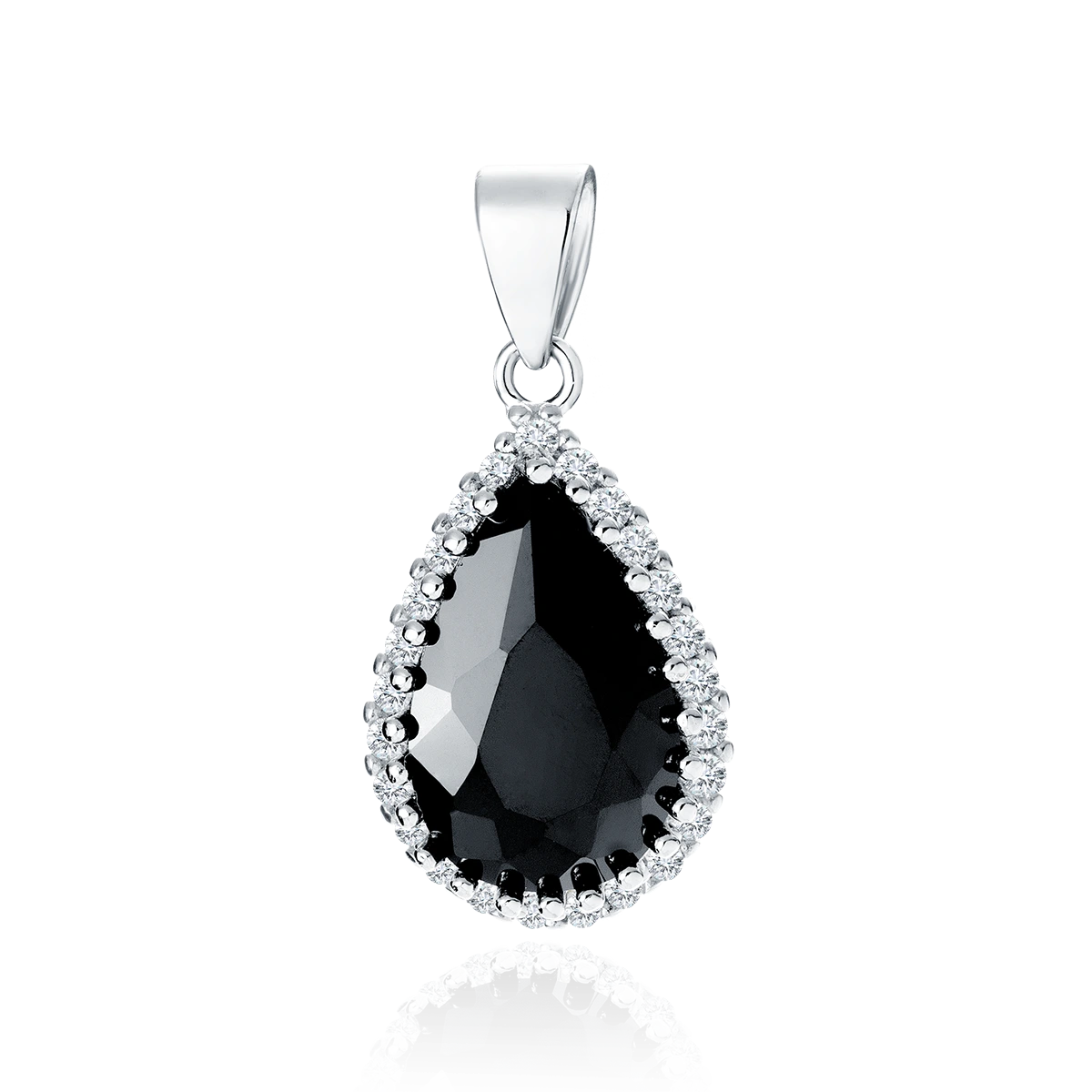 Srebrna zawieszka próby 925 z centralnie osadzoną czarną cyrkonią w kształcie łezki, otoczoną lśniącymi białymi cyrkoniami. Pokrycie rodem nadaje biżuterii elegancki połysk i chroni ją przed matowieniem. To efektowny dodatek, który podkreśli zarówno codzienne, jak i wieczorowe stylizacje.