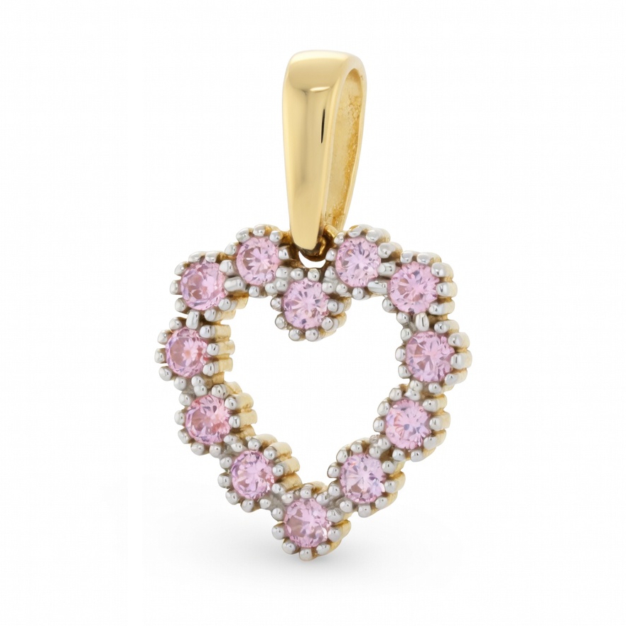 Złota zawieszka próby 585 w kształcie serca to romantyczna i kobieca propozycja na każdą okazję. Ozdobiona lśniącymi różowymi cyrkoniami, które zostały podkreślone rodowaniem, pięknie odbija światło i nadaje biżuterii wyrazistego blasku. Idealna na prezent dla ukochanej osoby lub jako symbol miłości noszony na co dzień.